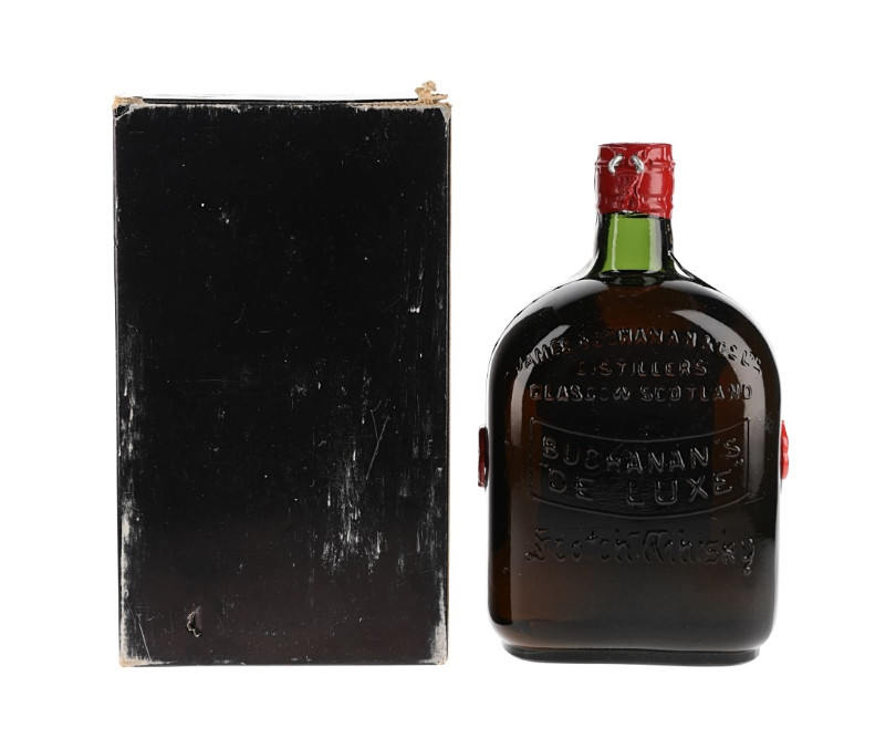 A bottle of Buchanan's De Luxe Scotch Whisky, sealed with a spring cap closure.