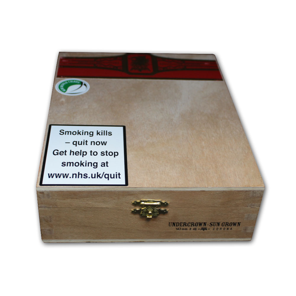 The Undercrown SG features an Ecuadorian Sumatra seed, Sun-Grown wrapper. The binder is a Connecticut River Valley Stalk Cut/Cured Sun Grown, complimenting a powerhouse blend of Nicaraguan premium fillers. One leaf of extensively aged Ligero from the Nueva Segovia region along the border of Honduras has been selected to enhance the strength of the blend.