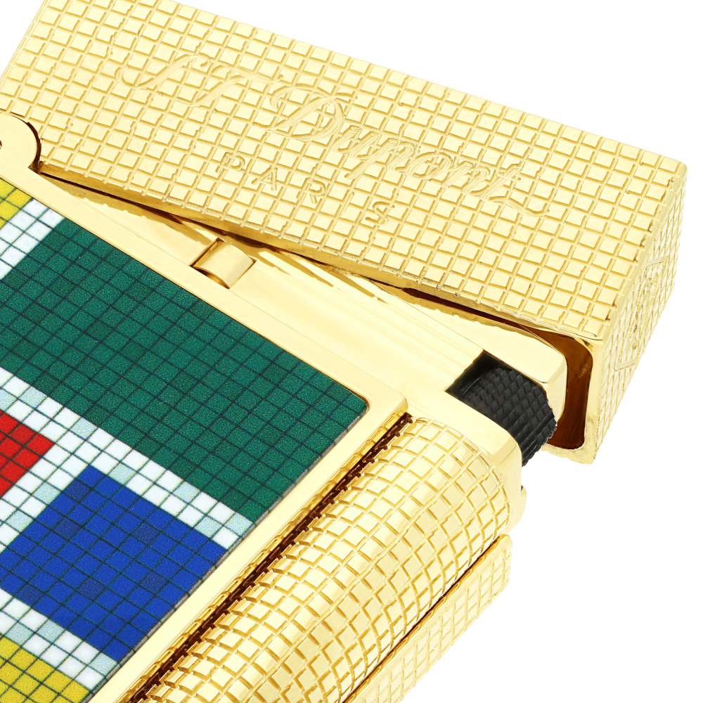 Line 2 Cling cigar lighter in brilliant multicolour lacquer and palladium finish. Featuring a double yellow flame and the famous "Cling" on opening.