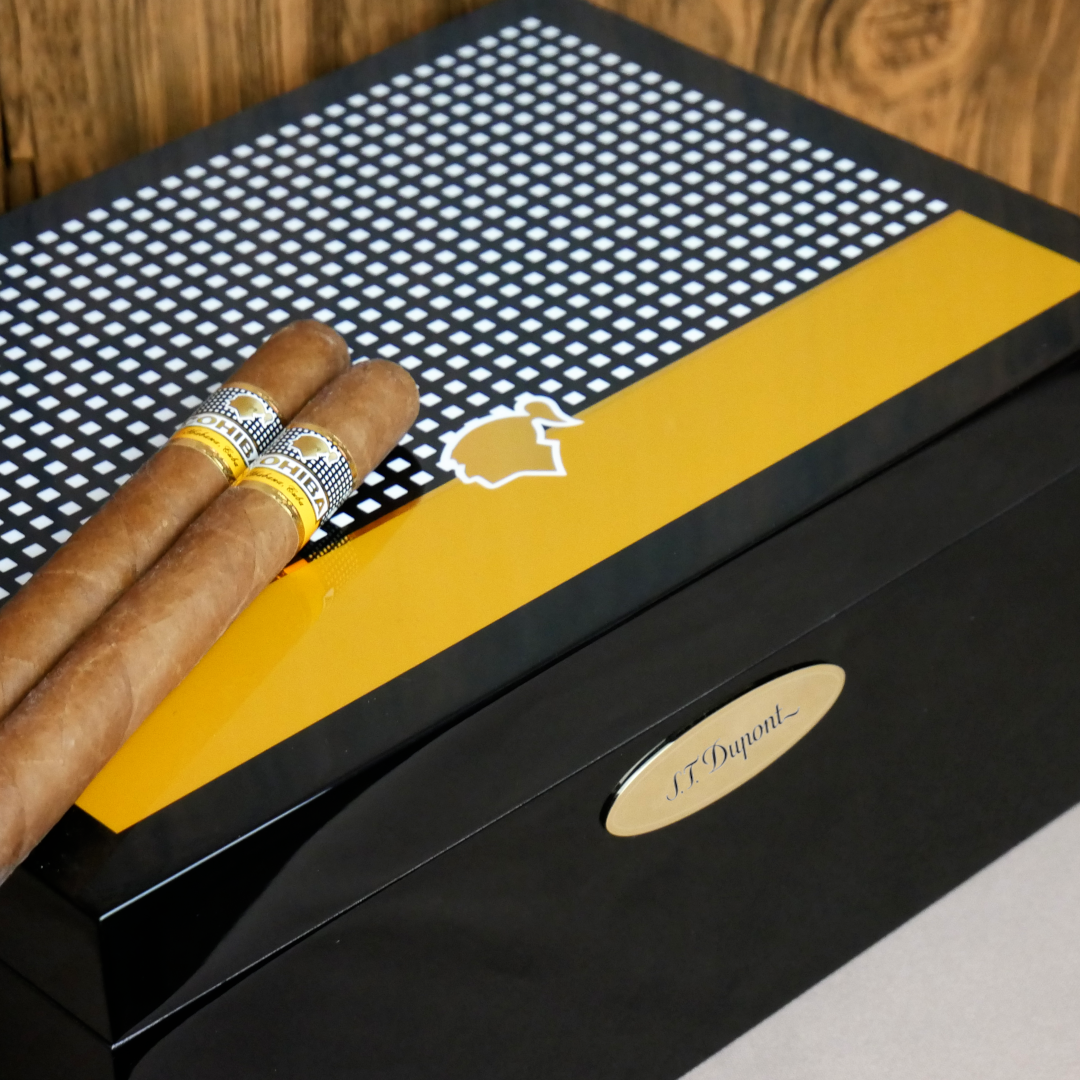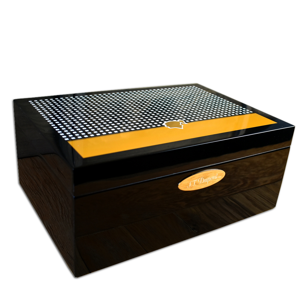 The ST Dupont Cohiba Humidor contains space for 50 cigars and is finished in Okoumé wood and its outer casing is in black and yellow natural lacquer.