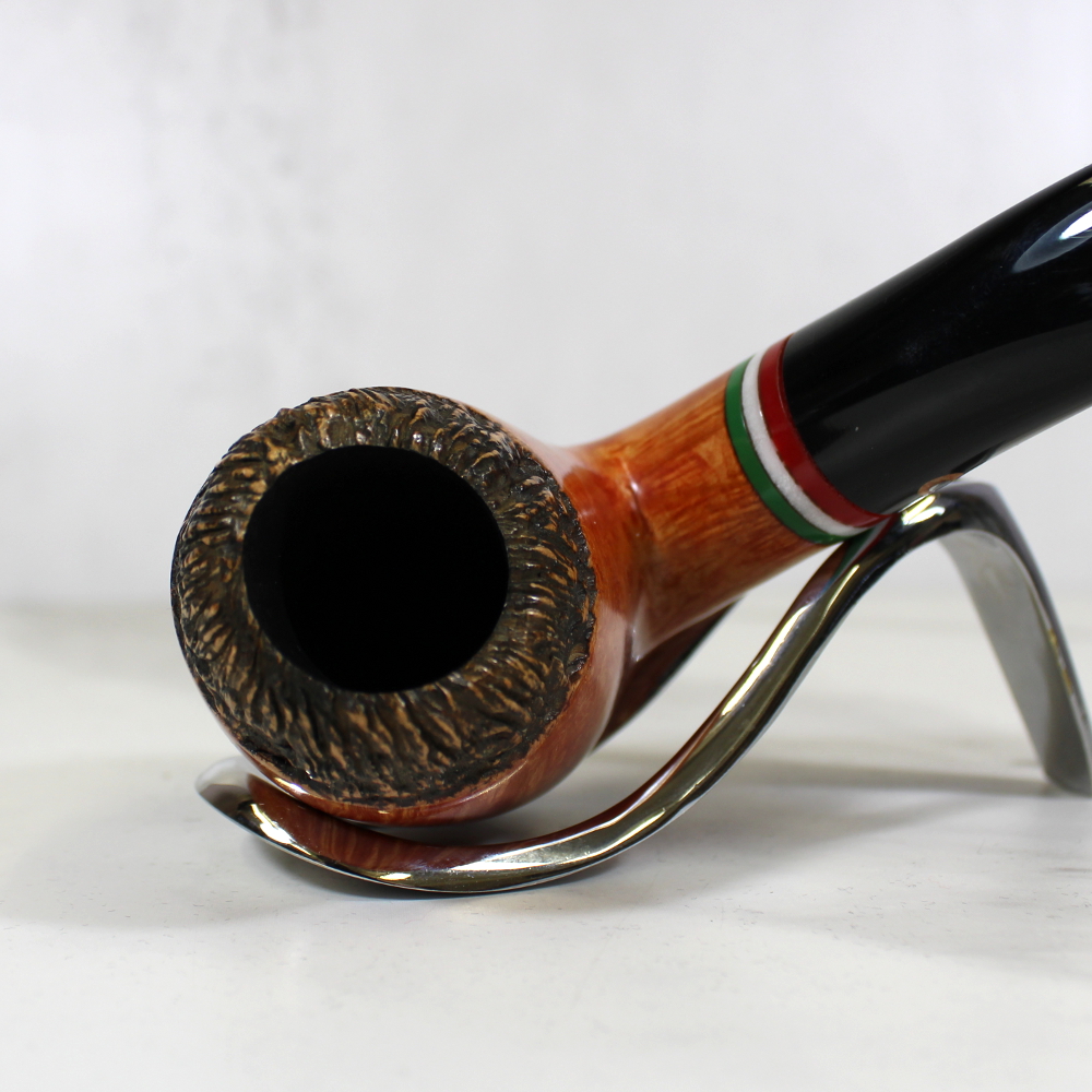 A great Pipe, with a fantastic “Flame” Grain. This Bent TRICOLOUR Briar ‘F’ also has an unusual Brown Rusticated Top to the Bowl. The Black Acrylic Mouthpiece joins the Shank with the Green, White & Red Italian Tricolour to give it’s Italian identity.