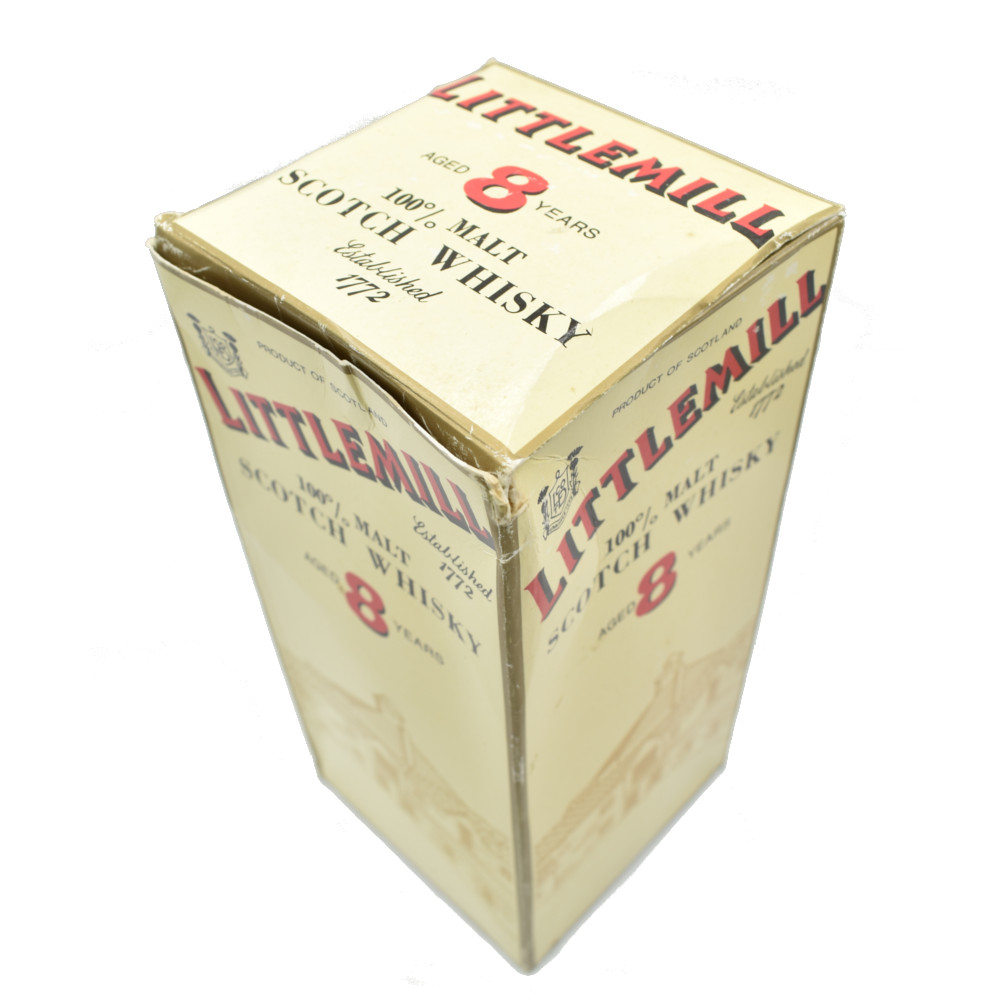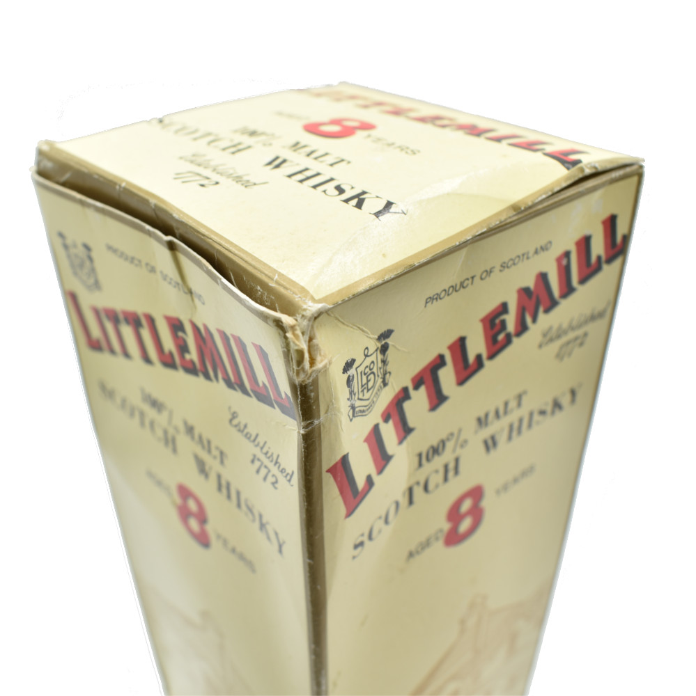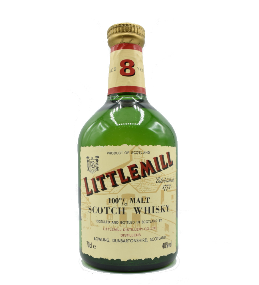 An official bottling of Littlemill 8 Year Old in the dumpy green bottle and yellow label.