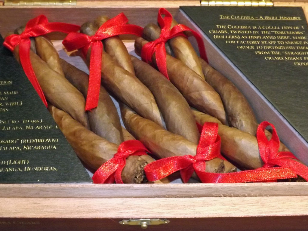 The Culebra is a collection of 3 cigars, twisted by the Torcedors (rollers) made for factory rollers to smoke in order to distinguish them from the straight cigars intended for export.