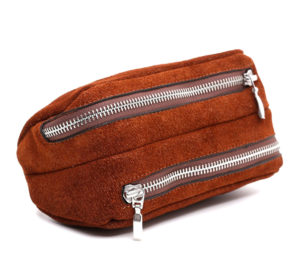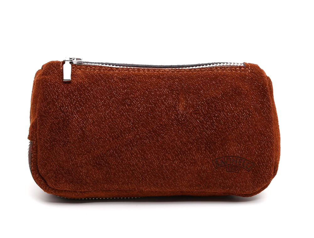 Suede leather bag in burnt colour, suitable to hold 2 pipes and loose tobacco. The bag is equipped with a zipper on the top to deposit the tobacco and two zipper on the bottom to accommodate the 2 pipes in different compartments. The room dedicated to the tobacco storage is covered in latex and you will be able to fill it without drying it out and keeping it in a perfect state of conservation.