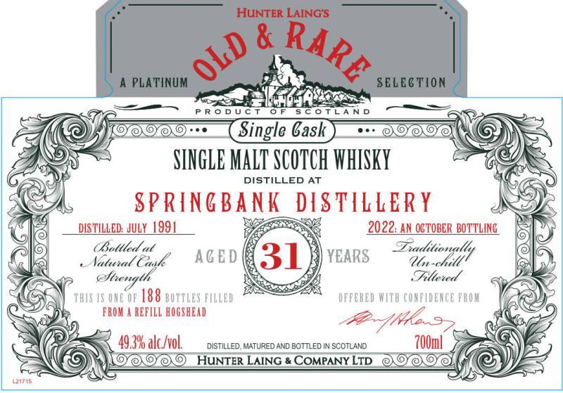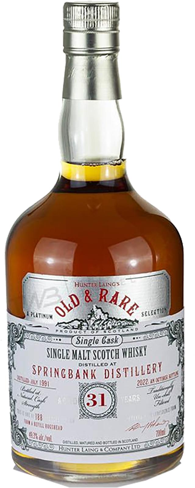 Springbank 31 Year Old 1991 vintage Campbeltown single malt Scotch whisky.