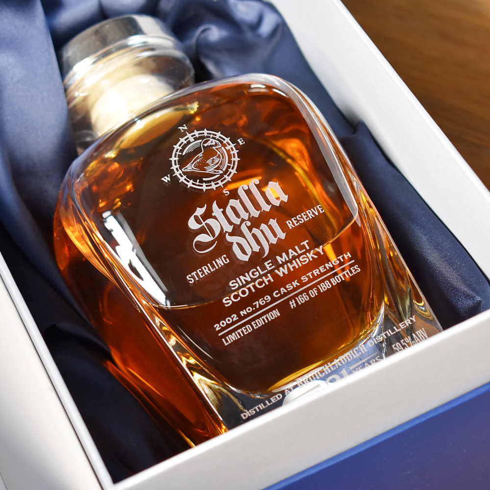This exquisite single cask, of only 188 bottles, is elegantly presented in a stunning engraved glass decanter that elevates any connoisseur’s whisky cabinet, with a matching lined, navy blue box and silver details.
