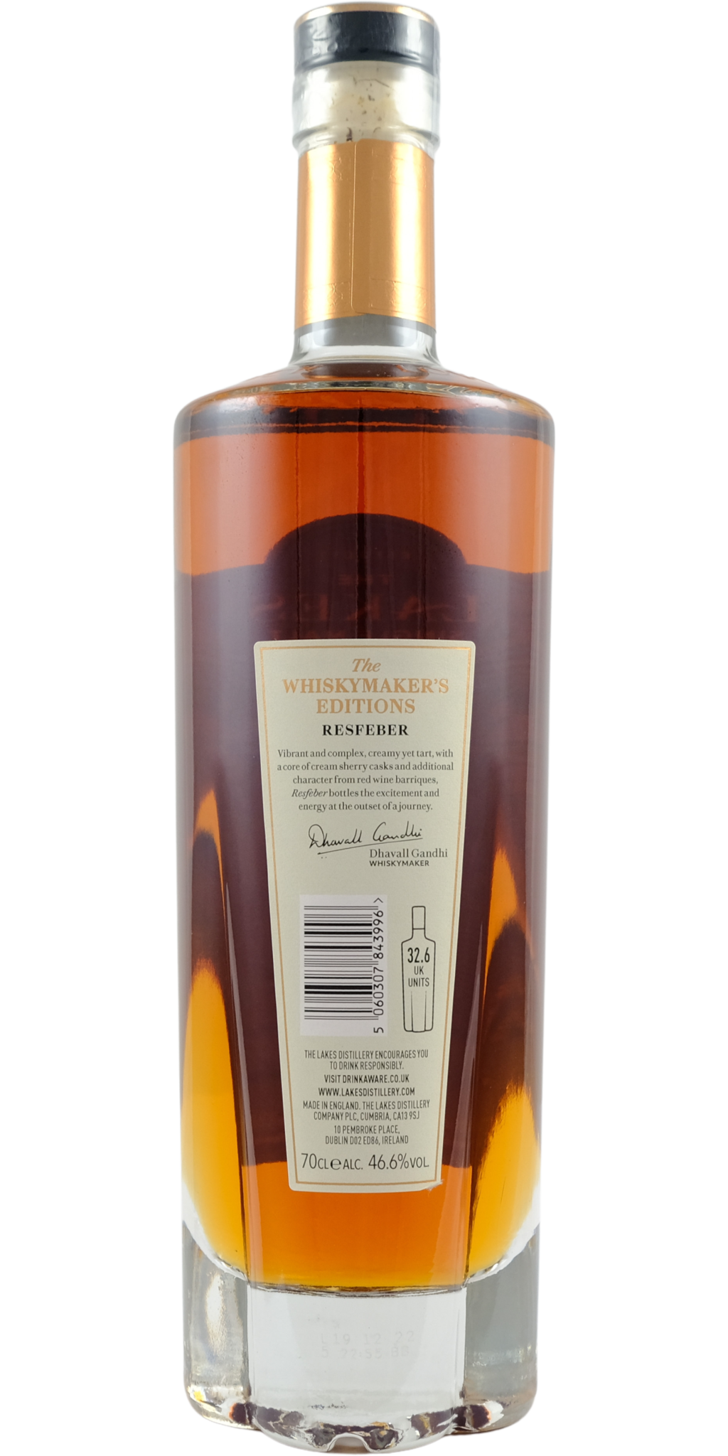 The Lakes are venturing into less-explored sherry cask territory-vibrant and complex, creamy yet tart, with aromas of apple dipped in toffee treacle, gentle baking spices, notes of Maraschino cherry and rose petal preserve and a warming finish.