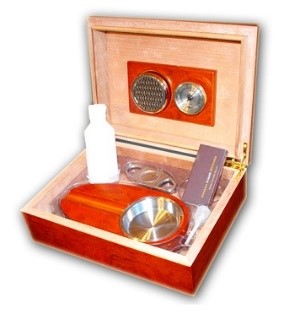 This humidor starter pack would make the ideal gift for that special someone who is either new to cigar smoking, or interested in starting up. This attractive Rosewood humidor comes with all the accessories needed to start storing your cigars safely straight away! The pack comes with a cigar cutter, hygrometer, humidifier, humification solution, and care and set up instructions. This humidor can store up to 20 Churchill size cigars, or 25 Petit Corona size cigars. Click the image for more information!