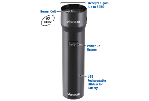 The XFlame Lighter is a fully electronic, battery powered device that heats up rapidly and is rechargeable. The burner is designed to evenly light up to a 62 ring gauge cigar with minimal effort.